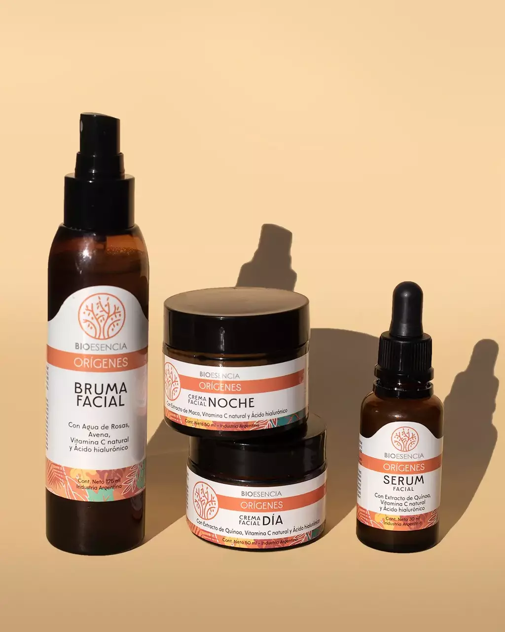 Este kit único incluye productos formulados con ingredientes naturales y activos reconocidos por sus beneficios para la piel: - Sérum concentrado Orígenes: enriquecido con ácido hialurónico, vitamina C natural, extracto de flor de granada y quinoa ancestral, para hidratar profundamente y revitalizar la piel. - Bruma facial Orígenes: tónico natural con agua de rosas, avena, extracto de flor de granada, ácido hialurónico y vitamina C, que refresca y calma la piel con un aroma selvático. - Crema de día Orígenes: combina quinoa, aceite de almendras, extracto de flor de granada, ácido hialurónico y vitamina C para proteger, nutrir y mantener la piel luminosa durante el día. - Crema de noche Orígenes: formulada con extracto de maca, aceite de almendras y otros ingredientes ancestrales que regeneran y revitalizan la piel mientras descansás.