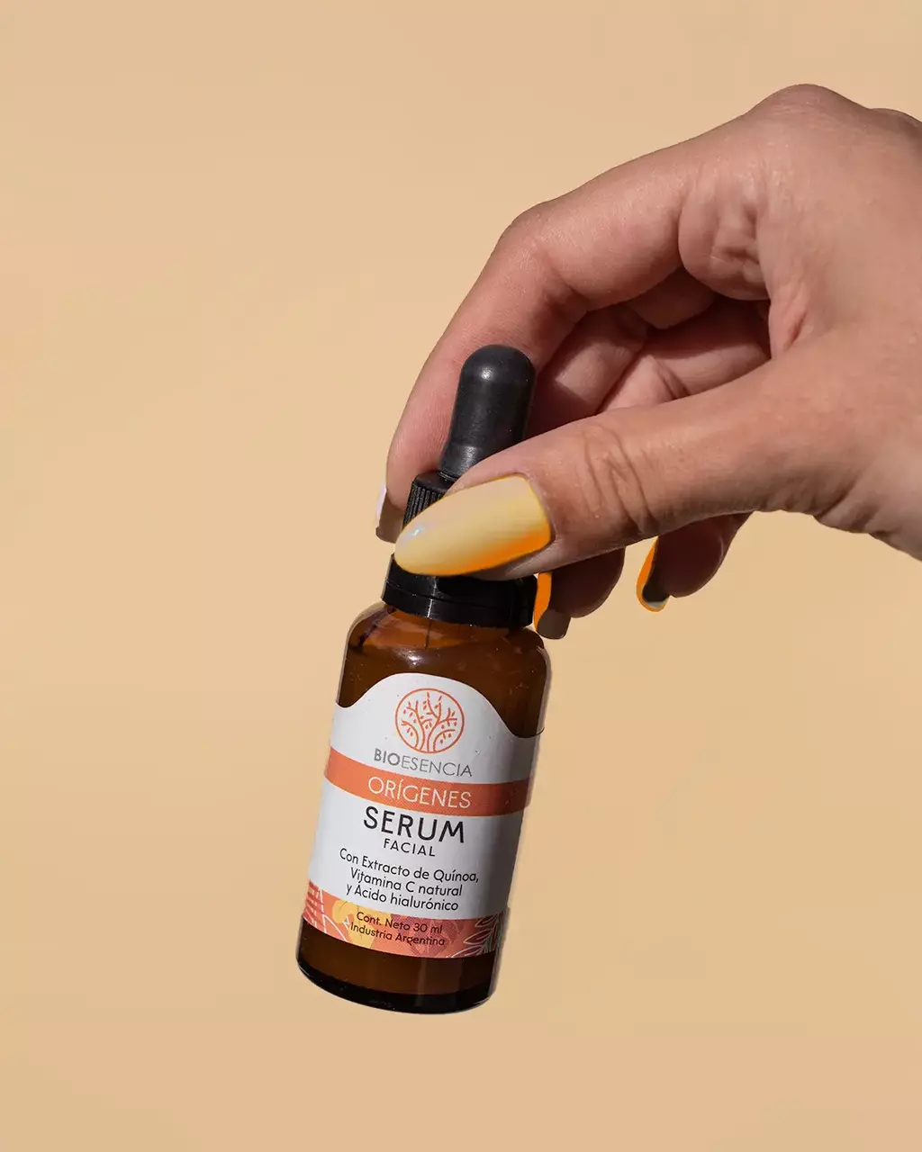 El Serum Facial Orígenes combina ácido hialurónico, vitamina C natural, flor de granada y quinoa ancestral para brindar una hidratación profunda, mejorar la elasticidad y suavizar líneas finas.